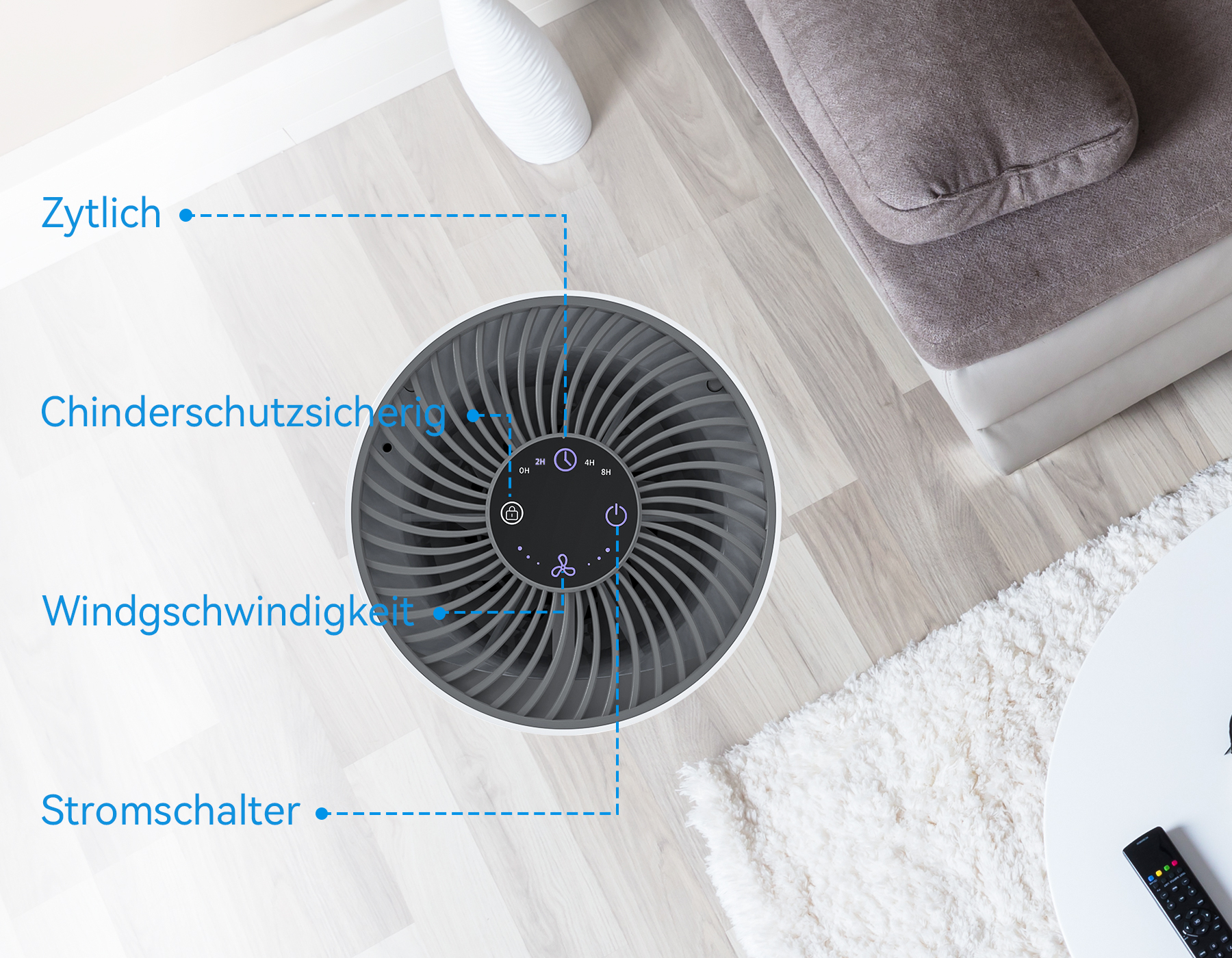 • Smarte & praktische Steuerung: Leicht einstellbare Lüftergeschwindigkeiten und ein Timer ermöglichen eine einfache Bedienung.